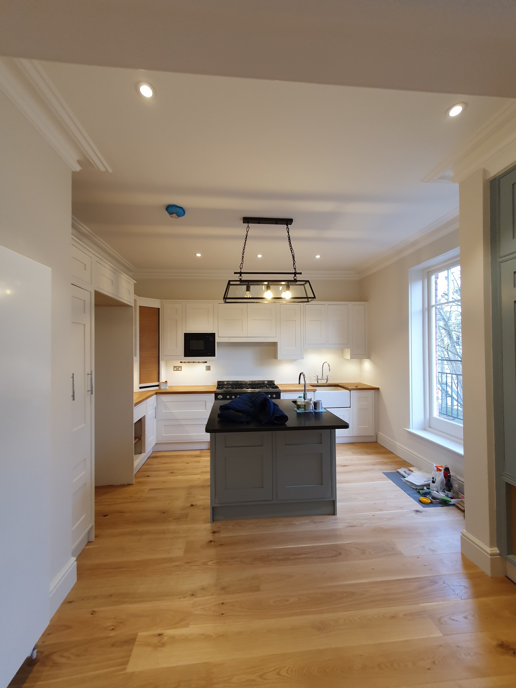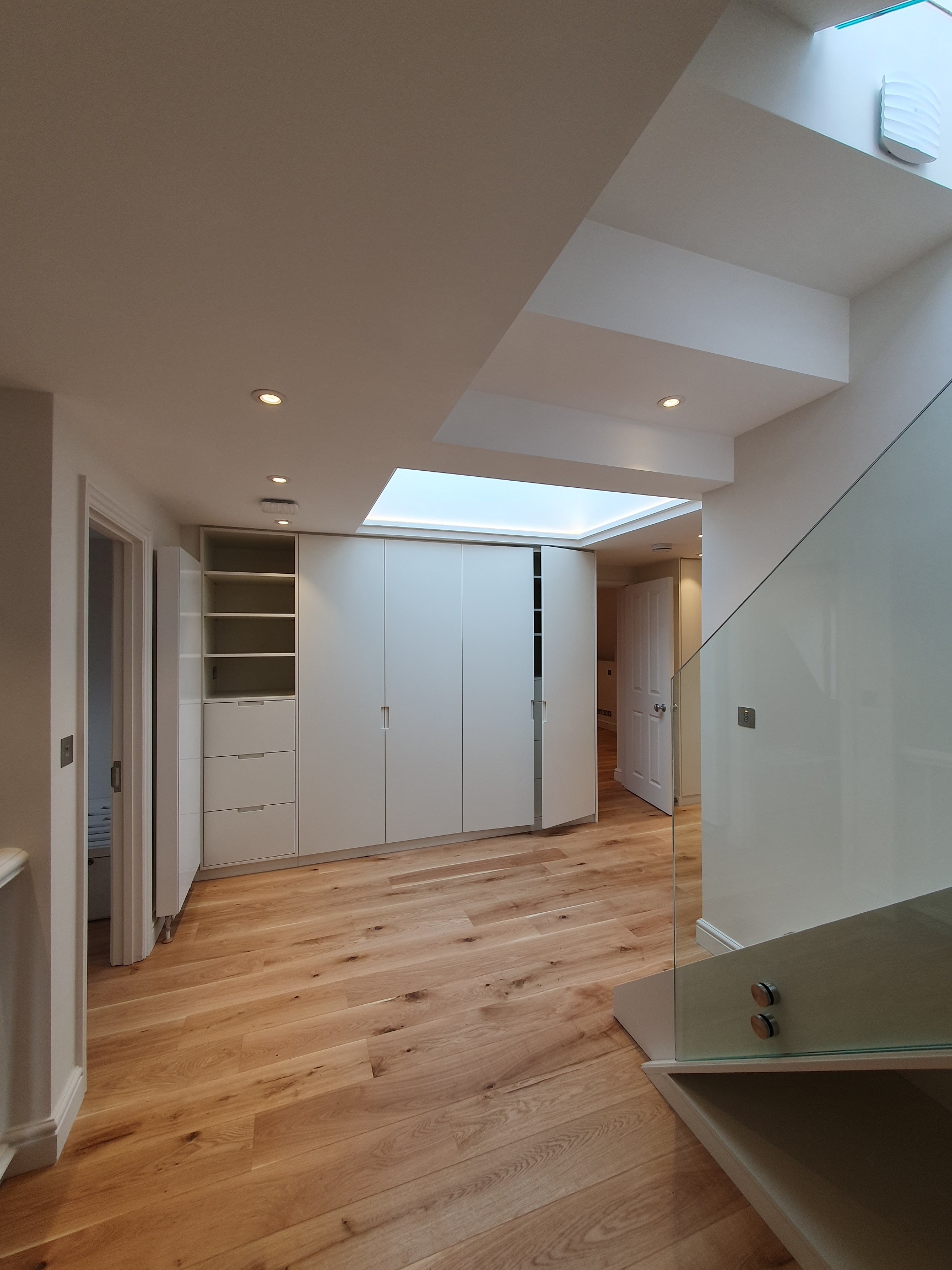 The works comprise the refurbishment of the 2nd and 3rd floors comprising this flat plus the terrace above including replace the gas boiler system with an air sourced heat pump system serving all heating and hot water to the flat via new radiators, strip existing heating system, new floating wood floors, new bathrooms and cloakroom, joinery, some new electrics, complete internal redecoration, replacement of all windows, demolition of glazed lantern accessing the terrace and it’s replacement with a Glazing Vision motorised rooflight, new staircase between 3rd floor and terrace.